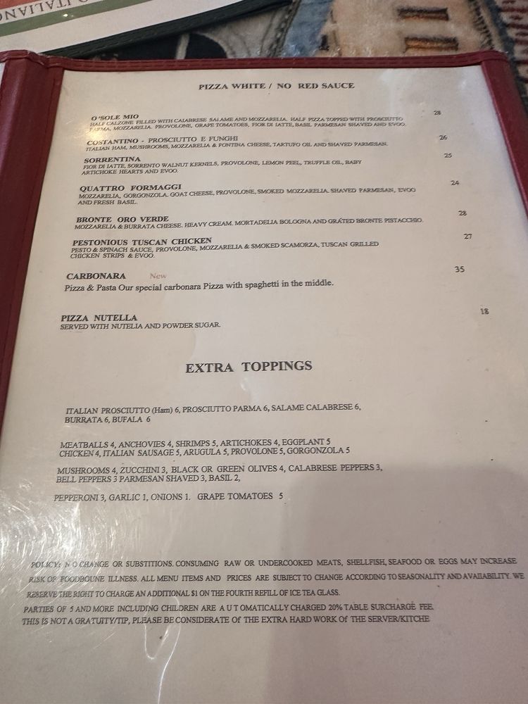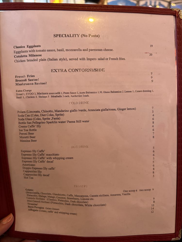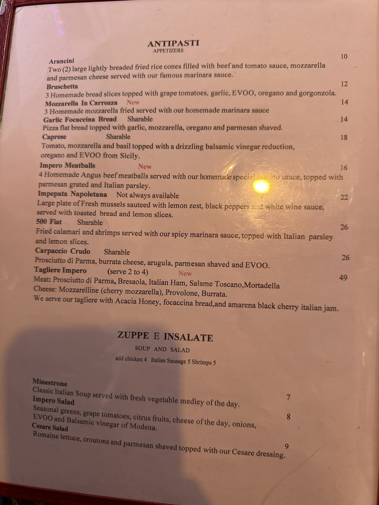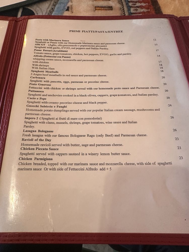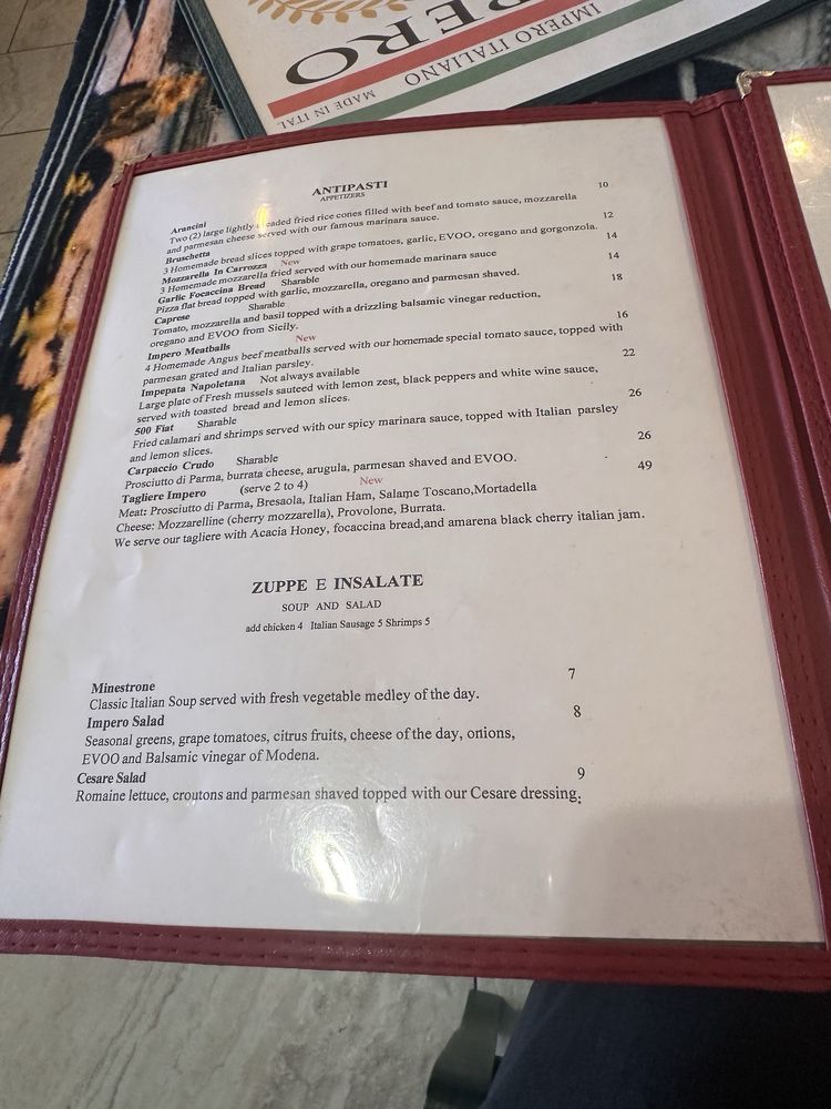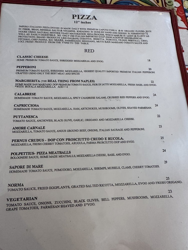 Impero Italiano offers a wide range of authentic Italian dishes in a cozy and welcoming atmosphere. The menu includes classic pizzas like Margherita and Calabrese, pasta dishes like Spaghetti Meatballs and Ravioli of the Day, and unique white pizzas like Sorrentina and Bronte Oro Verde. Customers rave about the quality and taste of the food, with reviews mentioning the delicious pizza, flavorful meatballs, and delightful desserts like tiramisu. The restaurant is known for its attentive service and family-friendly ambiance, making it a popular spot for both locals and visitors. With a focus on traditional Italian flavors and a diverse menu that caters to various dietary preferences, Impero Italiano is a must-visit for Italian food enthusiasts looking for an authentic dining experience.